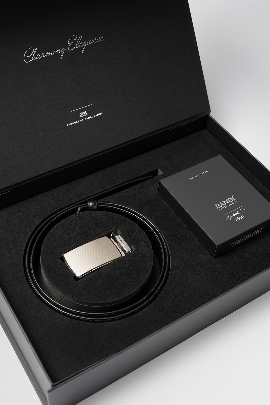 Luxusná darčeková kazeta – Parfumovaná voda BANDI Aprimé For Men a opasok AUTOMAT 79 Nero