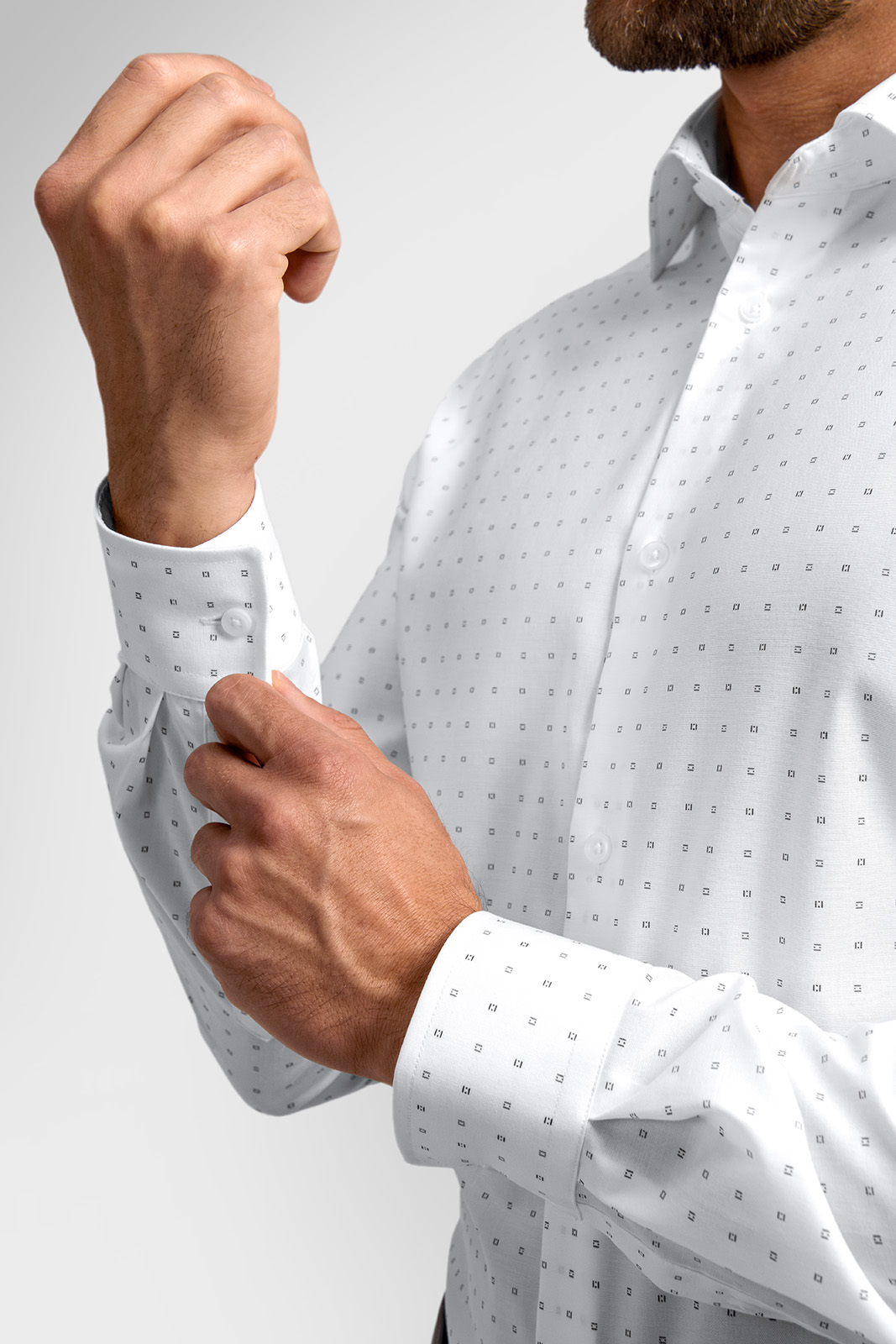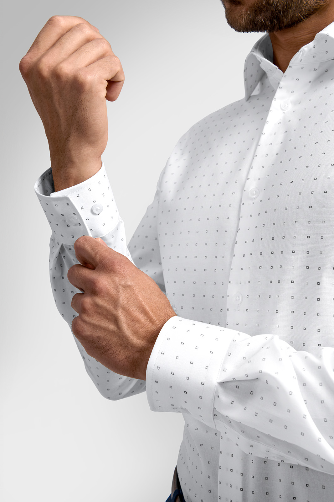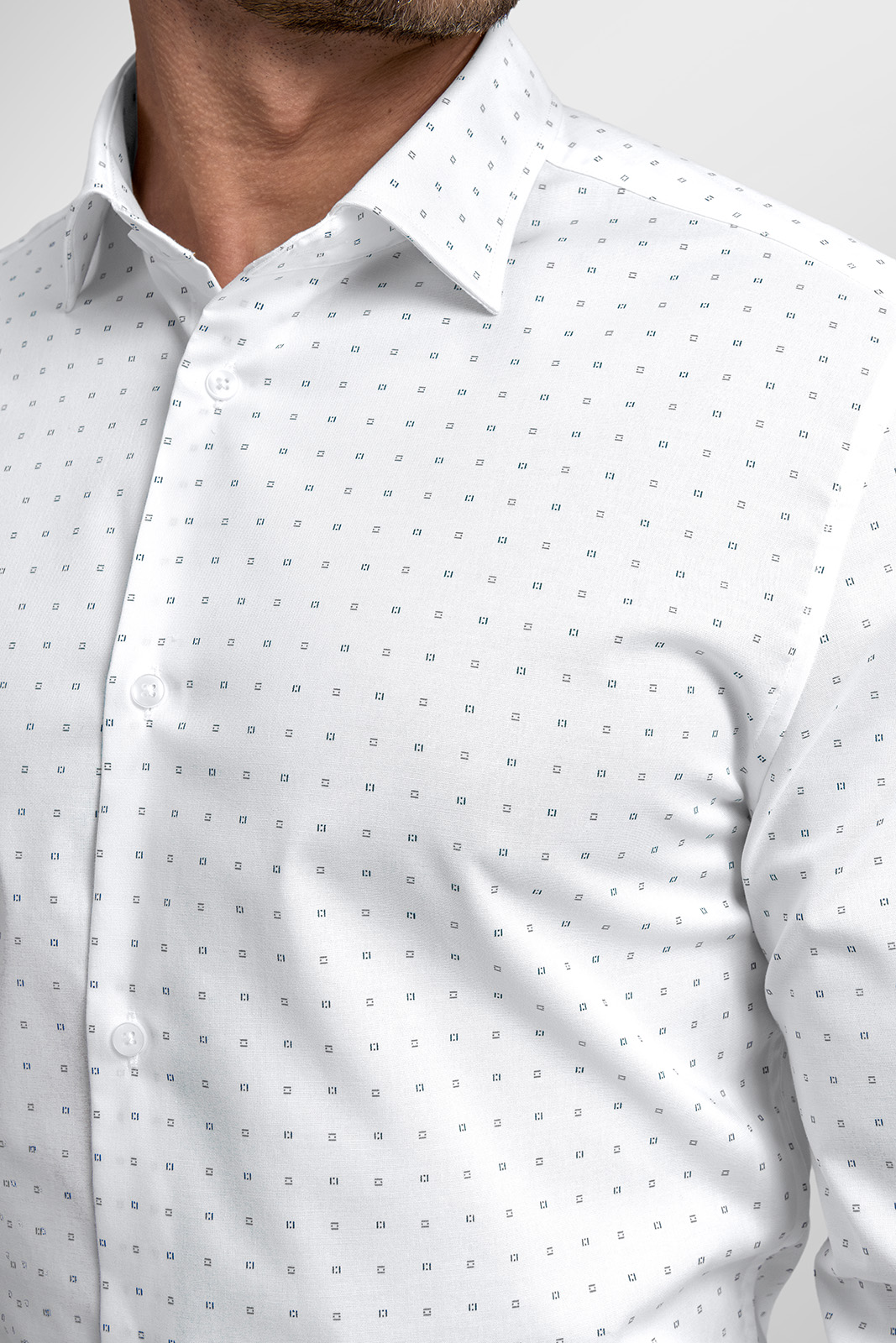 Košeľa je vyrobená z prémiového bavlneného materiálu s prímesou elastanu, ktorý zaisťuje výbornú priedušnosť, jemnosť na dotyk a zároveň dostatočnú pružnosť. Vďaka tomu sa košeľa perfektne prispôsobí postave a zachová si tvar aj pri celodennom nosení.