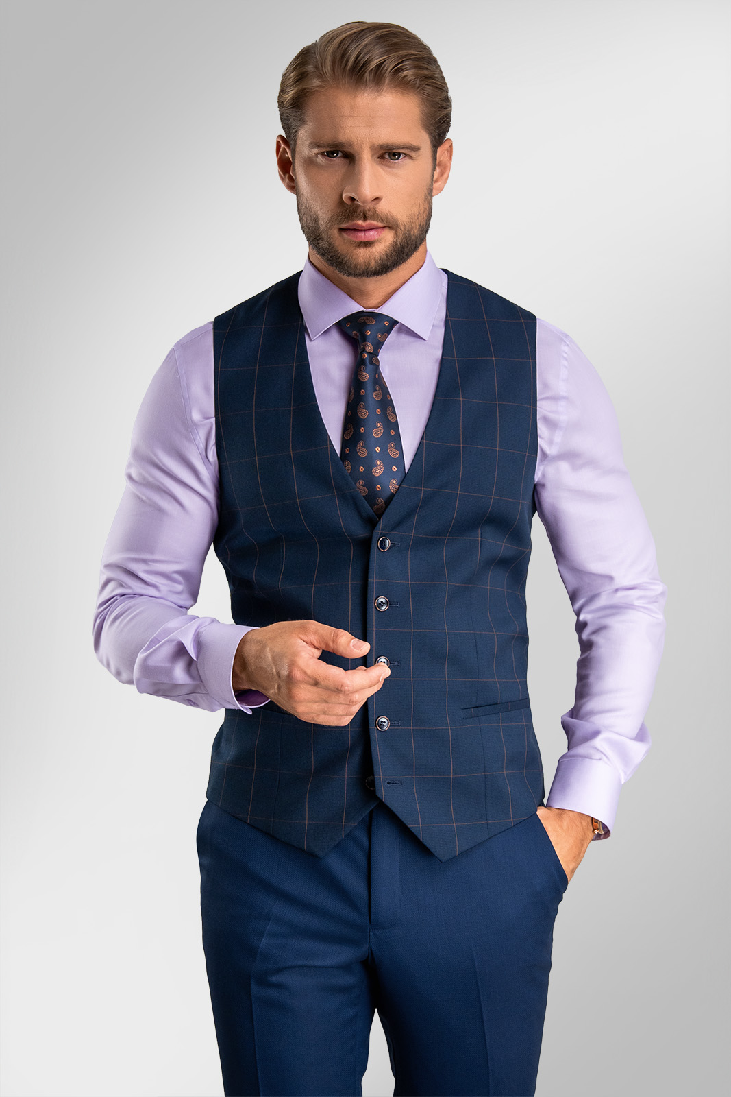 Tmavomodrá farba v kombinácii s decentným károvaným vzorom v žltohnedom odtieni pôsobí originálne a zároveň vkusne. Vesta sa skvele hodí ku klasickým jednofarebným košeliam bielej, svetlomodrej či smotanovej farby. Ak chcete vytvoriť zaujímavejší outfit, môžete ju kombinovať aj s jemne štruktúrovanými látkami.