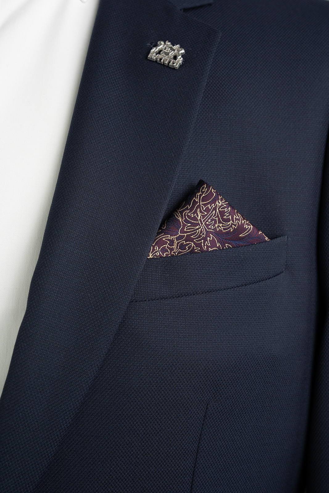 Kombinujte vreckovku s kravatou BANDI v tmavomodrých, vínových alebo zlatých odtieňoch. Najlepšie vynikne s jednofarebnou košeľou, ktorá podčiarkne jeho vzor.