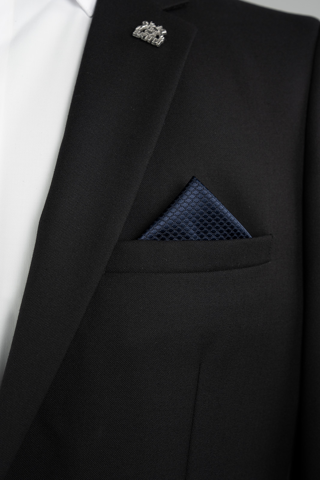 Tmavomodrá vreckovka skvele doplní tmavý oblek v odtieňoch čiernej, sivej alebo tmavomodrej a najlepšie vynikne v kombinácii s bielou košeľou.