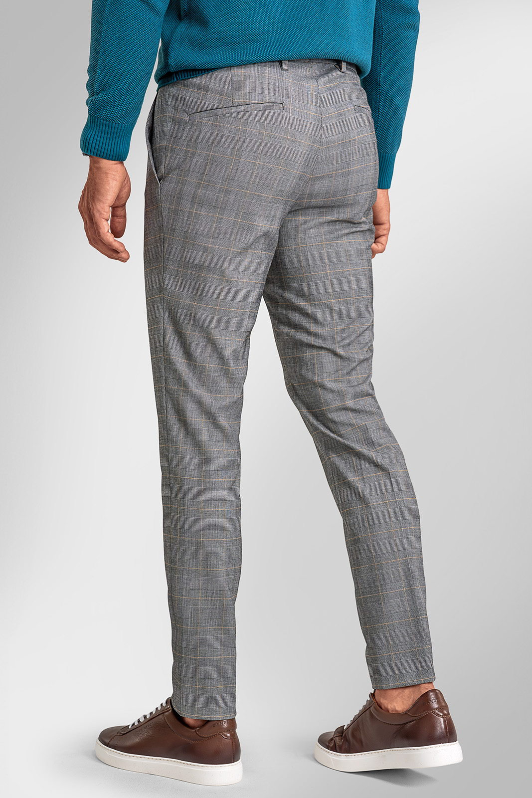 Stredne sivý tón s jemným károm Glencheck a decentnou okrovou linkou dodáva nohaviciam osobitosť bez toho, aby pôsobili nápadne. Vďaka univerzálnemu farebnému vyhotoveniu ich ľahko zladíte so sakom, so svetrom aj s voľnočasovým tričkom a zakaždým vytvoríte outfit vhodný na konkrétnu príležitosť.