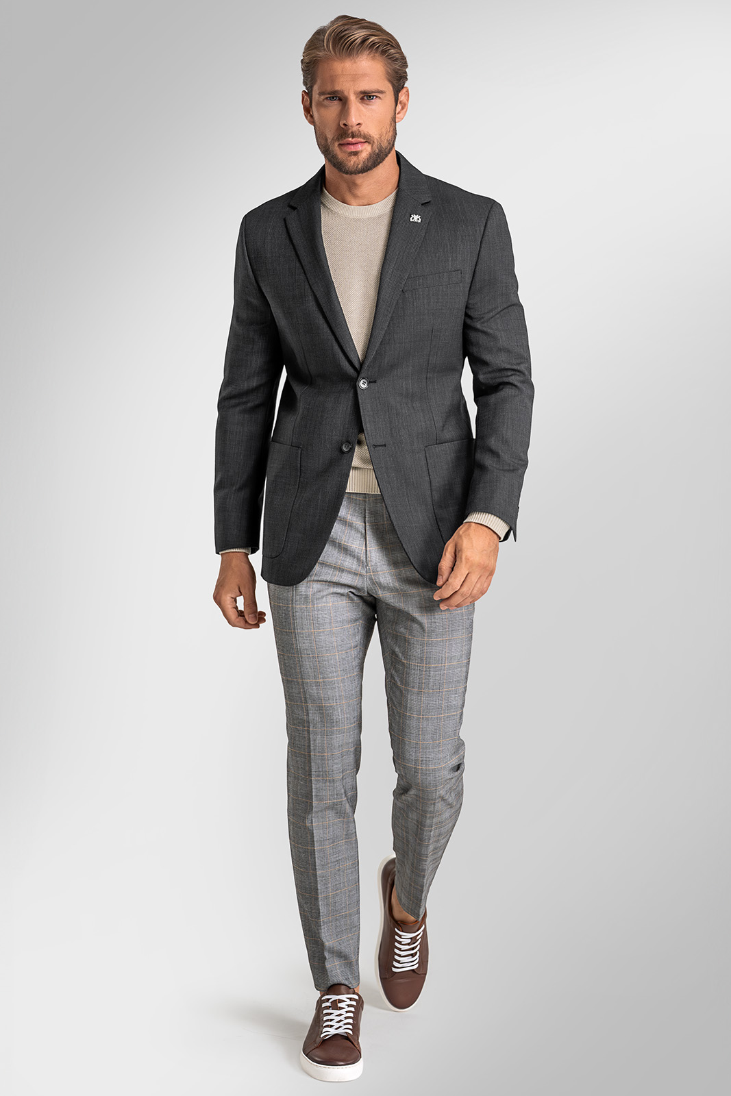 Zmes polyesteru, viskózy a elastanu je pevná, odolná a zároveň sa príjemne nosí. Prímes elastanu dodáva potrebnú pružnosť pri pohybe, čo ocenia najmä muži preferujúci užšie strihy. Praktickou výhodou je aj jednoduchá údržba – na rozdiel od klasických oblekových variantov sa tento model môže prať v práčke.