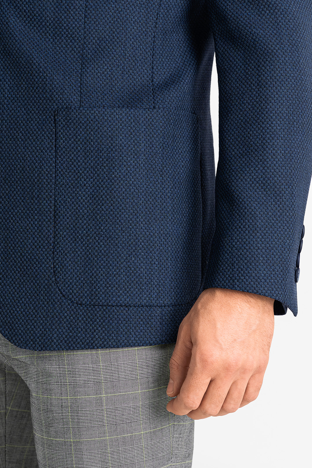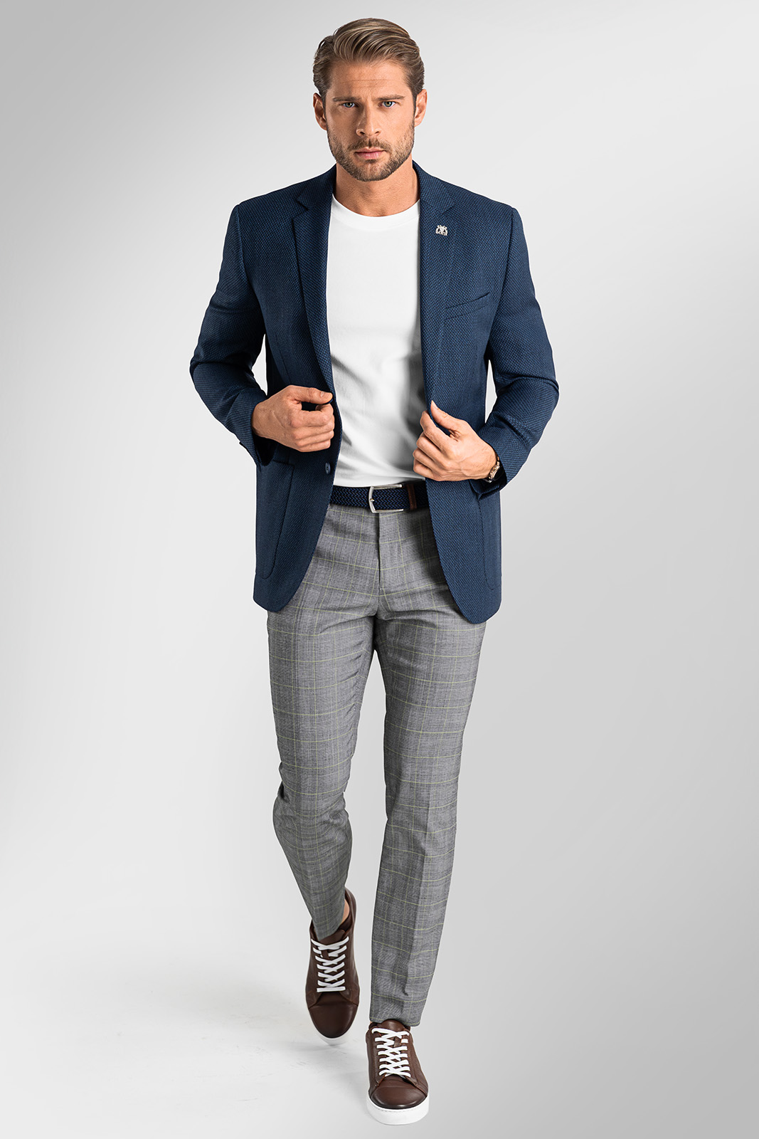 Ľahká polopodšitá konštrukcia bez zbytočných výstuží zabezpečuje pohodlie a nakladané vrecká podčiarkujú moderný, mierne neformálny štýl. Zadní rozparok zároveň prispieva k voľnosti pri pohybe. Strih SLIM je vhodný na štíhle a štandardné postavy.