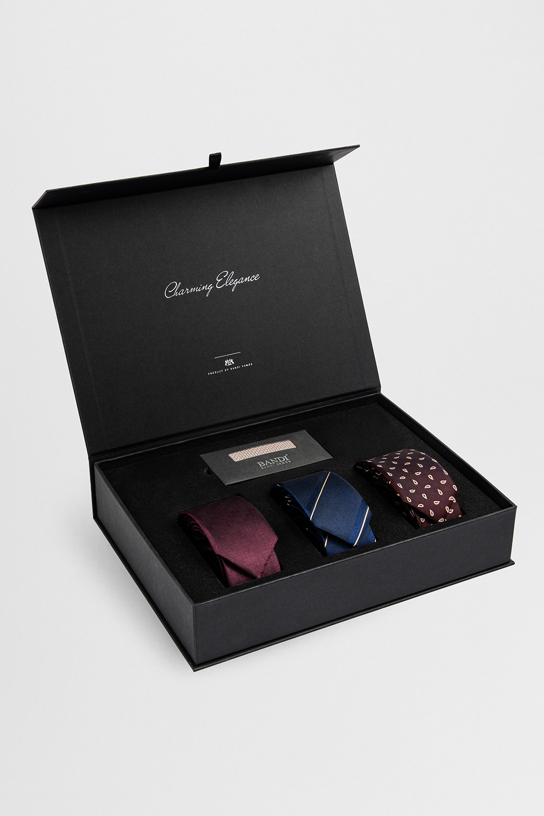 ďalšie informácieHodvábny komplet obsahuje tri kravaty v rôznych farbách a vzoroch. Doplnený je o zlatú vreckovku, ktorá je rovnako z hodvábneho materiálu a skombinovať ju môžete s každou kravatou zo setu.