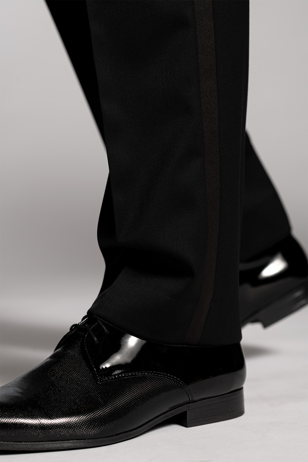 Smokingové nohavice tradične dopĺňajú lesklé lampasy na vonkajších bokoch nohavíc. Model BANDI Rivello je navyše vybavený praktickými prvkami, ako je zadný rozparok na saku a pútka na nohaviciach, ktoré zvyšujú komfort pri nosení.