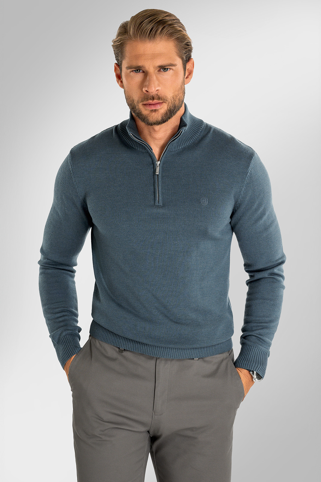 ďalšie informácieZips dodáva poloroláku jemne športový charakter, ktorý však vďaka premyslenému strihu a decentným farbám zostáva plne v medziach elegantného obliekania. Modrosivý odtieň pôsobia sviežo, opticky rozjasňujú celý outfit a zároveň zachovávajú formálny dojem.