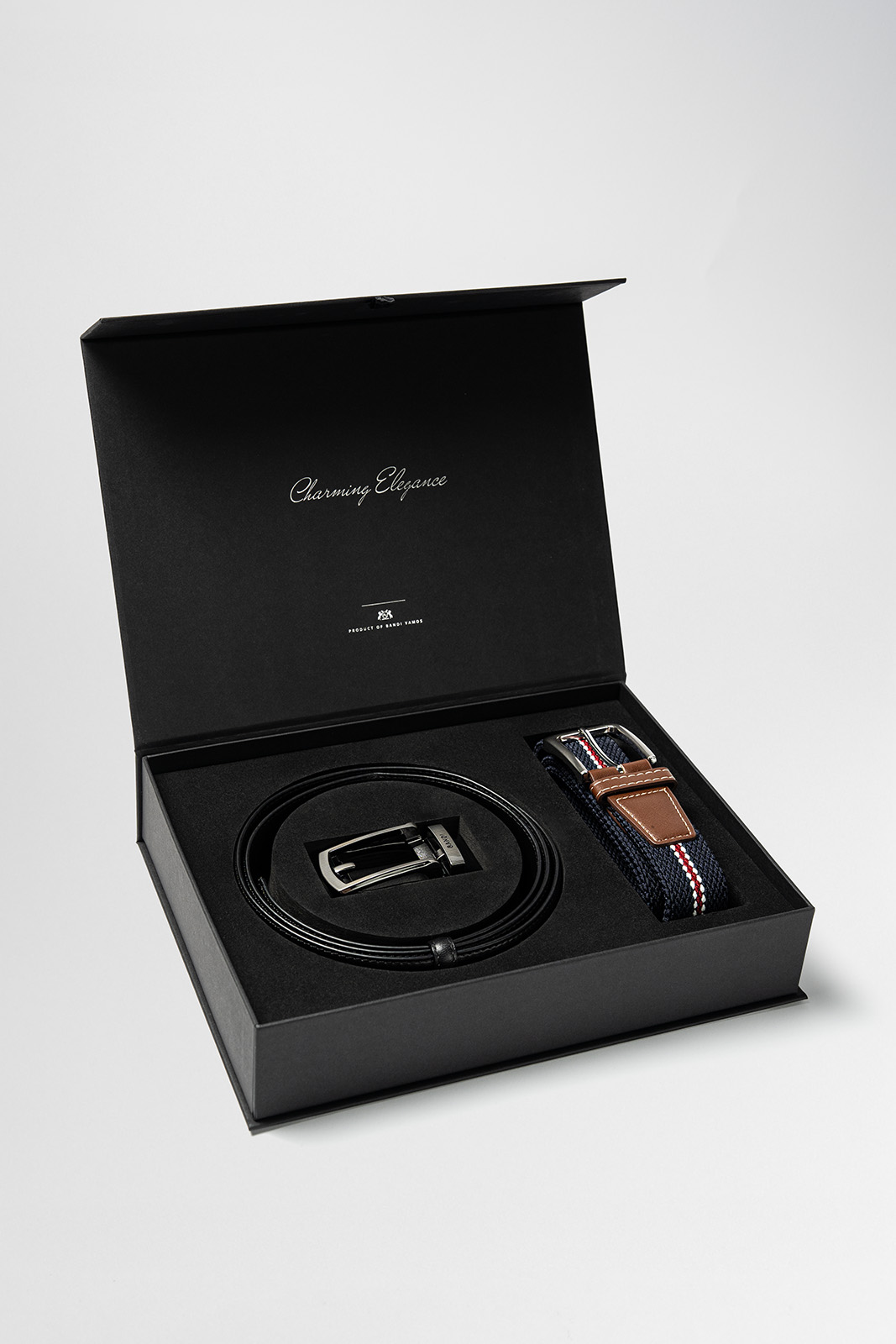 V praktickej sade nájdete ideálnu kombináciu dvoch základných typov opasku. Univerzálny čierny kožený opasok sa perfektne hodí k spoločenskému obleku alebo bavlneným nohaviciam. Elastický voľnočasový opasok potom skvele využijete k voľnočasovým chinos nohaviciam a rifliam.