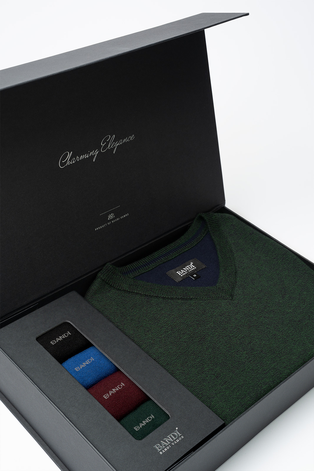 Darčeková súprava pánskeho svetra BANDI a ponožiek BAMBOO predstavuje dokonalé spojenie pohodlia a nadčasovej elegancie. Perfektne dopĺňa pánske outfity do kancelárie, na voľný čas aj pri neformálnych spoločenských príležitostiach.