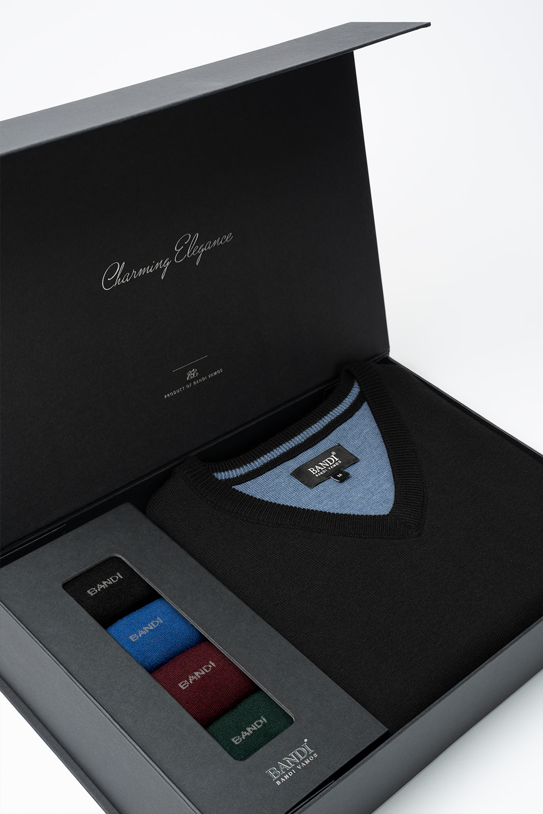 Darčeková súprava pánskeho svetra BANDI a ponožiek BAMBOO predstavuje dokonalé spojenie pohodlia a nadčasovej elegancie. Perfektne dopĺňa pánske outfity do kancelárie, na voľný čas aj pri neformálnych spoločenských príležitostiach.